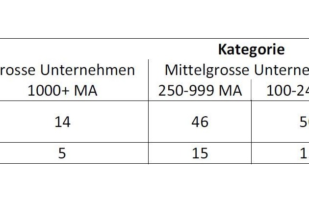 Dieses Jahr wurde der Swiss Arbeitgeber Award erstmals in vier Grössenkategorien (vgl. Tabelle) vergeben. So konnte Bewertungsunterschieden, die sich aufgrund der Unternehmensgrösse ergeben, Rechnung getragen werden. In der Kategorie der grossen Unternehmen (1000 und mehr Mitarbeitende) wurden die besten fünf der insgesamt 14 teilnehmenden Unternehmen als Top Arbeitgeber prämiert. Als Gewinnerin ging die SV Group hervor. In den beiden Kategorien der mittelgrossen Unternehmen wurden jeweils die Top 15 ausgezeichnet. An die Spitze der insgesamt 46 Unternehmen der Kategorie mit 250 bis 999 Mitarbeitenden schaffte es die Liechtensteinische Alters- und Krankenhilfe (LAK). Unter den 50 Unternehmen der Kategorie mit 100 bis 249 Mitarbeitenden verteidigte das Hotel Hof Weissbad erfolgreich seine letztjährige Spitzenposition. Von den 30 Unternehmen mit 50 bis 99 Mitarbeitenden wurden die besten 10 ausgezeichnet. Die ipt Innovation Process Technology AG konnte sich hier als Siegerin durchsetzen.