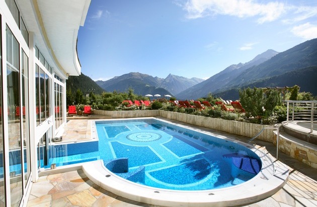 Die herrliche Bergwelt lässt sich auch im Sommer im Außenpool und im Panoramagarten des Hotels hervorragend genießen. Weiterer Text ueber ots und auf https://www.presseportal.ch. Die Verwendung dieses Bildes ist fuer redaktionelle Zwecke honorarfrei. Veroeffentlichung unter Quellenangabe: "obs/Sport- & Wellnesshotel Stock ****s"