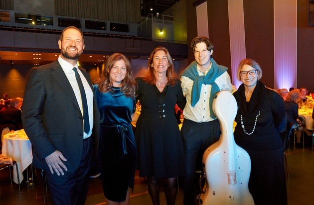 Sie freuen sich gemeinsam über einen klangvollen Jahresauftakt im KKL Luzern (von links nach rechts): Karim, Andrea und Nazly Twerenbold mit dem Cellisten Daniel Müller-Schott und Ambra Redaelli, Präsidentin des Orchestra Sinfonica di Milano. (Bild: Twerenbold Reisen Gruppe / Daniel Ospelt)