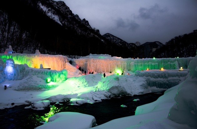 Farbenfrohes Spektakel am Sounkyo Onsen Ice Waterfall Festival. © ACworks