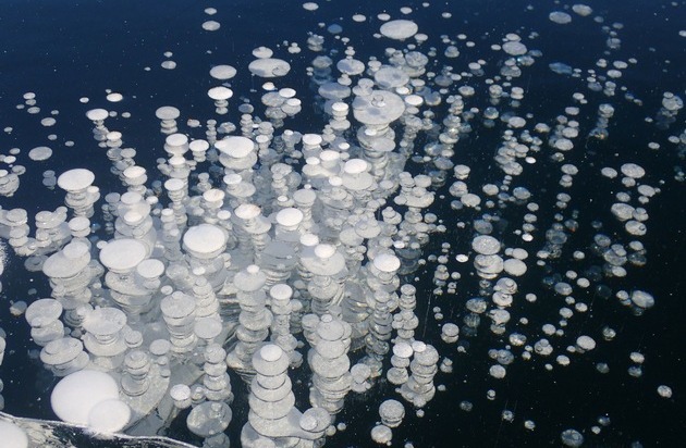 Ein anderes Phänomen findet sich im Nukabira-See in Kamishihoro auf Hokkaido von Januar bis Februar. So genannte «Ice Bubbles» formen faszinierende, schwebende Muster unter der Eisoberfläche. Dabei handelt es sich um Gas, das im Eis gefangen ist und in verschiedenen Tiefen gefriert. Anschliessend wird die Schneedecke sorgfältig entfernt, so dass an der Schwarzeis-Oberfläche das Schauspiel sichtbar wird. Auf Führungen durchqueren Winterwanderer die einzigartige Szenerie.