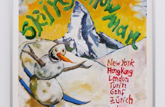 Jan Kiefer, Skiing Snowman, 2025 - Oil on cotton paper (framed) 70 x 55 cm | Courtesy suns.works
