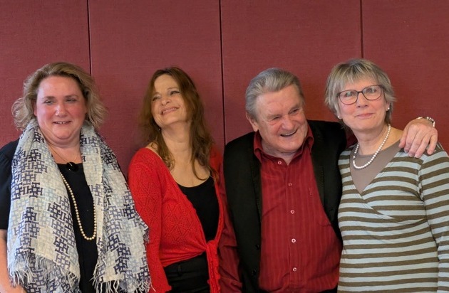 Die vier mit Schweizer Autobiographie-Awards für 2024 Ausgezeichneten freuen sich über die Auszeichnung ihrer Lebensgeschichten. V.l.n.r.: Nicole Stacher aus Speicher (AR), Sandra Findeisen aus Helgisried-Rohrbach (BE), András Széplaky aus Stein AG und die Gewinnerin des 1. Preises Rita Mühlebach aus Nidau bei Biel (BE)