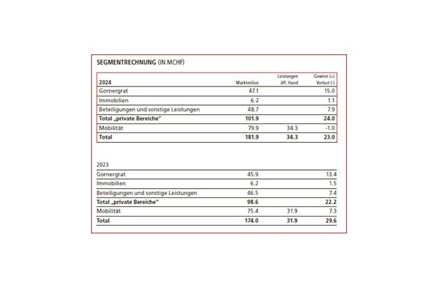 Segmentrechnung für privatwirtschaftliche Geschäftsbereiche (Gornergrat, Immobilien, Beteiligungen) und Service-public-Bereich (Mobilität)