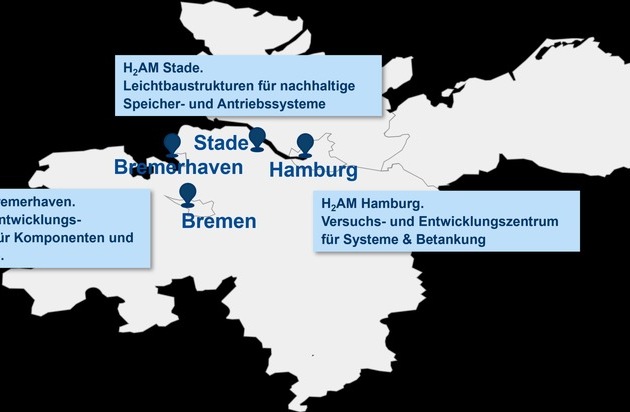 Überblick der Standorte des Hanseatic Hydrogen Center for Aviation and Maritime (H2AM) / Weiterer Text über ots und www.presseportal.de/nr/133006 / Die Verwendung dieses Bildes für redaktionelle Zwecke ist unter Beachtung aller mitgeteilten Nutzungsbedingungen zulässig und dann auch honorarfrei. Veröffentlichung ausschließlich mit Bildrechte-Hinweis.