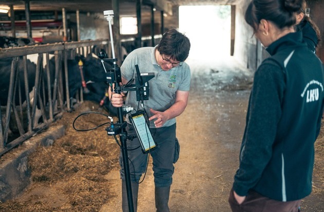 Eine Allianz aus der Landwirtschaftskammer des Elsass, dem Landesverband Baden-Württemberg (LKV BW) und grenzüberschreitenden Partnern arbeitet an Lösungskonzepten, die den Menschen, den Tieren und der Umwelt nachhaltig zugutekommen: Das Projekt ResKuh. Im Fall der Familie Fritsch ist das etwa eine Analyse der klimatischen Bedingungen im Stall. Dabei kommt ein spezielles Diagnosegerät zum Einsatz, welches auch beim zweiten Hinschauen an eine Mischung aus Zauberstab und Antenne erinnert. Alle vier Meter nimmt Clément Eck, Beauftragter Klimawandel bei der Landwirtschaftskammer Elsass und Pilot des ResKuh-Projekts Messungen vor und kann damit eine Klimakarte der Scheune entwerfen. Daraus lässt sich zum Beispiel ableiten, an welcher Stelle Ventilatoren Sinn machen oder andere Maßnahmen für ein besseres Raumklima hilfreich sind.