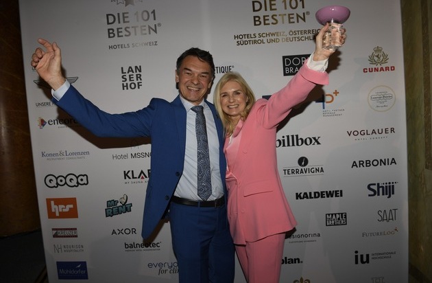 Das Sonnenalp Resort wurde als bestes «Luxury Family Resort» im DACH-Markt ausgezeichnet und stärkt damit seine führende Position in der Luxushotellerie. Der Preis wurde von Michael und Anna-Maria Fässler persönlich entgegengenommen. ©TINNEFELD TILGNER API 101 Besten Hotels Schweiz 2025
