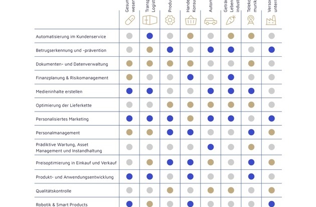 Anwendungsbereiche von KI: Relevanz unterscheidet sich nach Branchenzugehörigkeit. Bildquelle: valantic / Weiterer Text über ots und www.presseportal.de/nr/156917 / Die Verwendung dieses Bildes für redaktionelle Zwecke ist unter Beachtung aller mitgeteilten Nutzungsbedingungen zulässig und dann auch honorarfrei. Veröffentlichung ausschließlich mit Bildrechte-Hinweis.