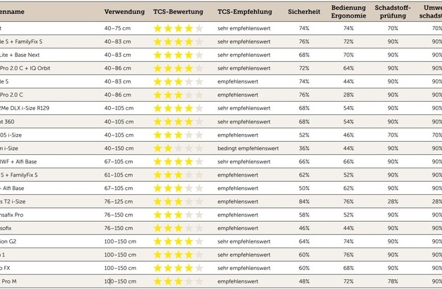 Trotz erhöhter Testanforderungen haben 10 Modelle das Prädikat "sehr empfehlenswert" erhalten. Sie zeichneten sich durch ihre Vielseitigkeit und Leistungsfähigkeit in allen Bewertungsbereichen aus. Neun weitere Modelle erhielten das Prädikat "empfehlenswert" aufgrund einer leichten Schwäche bei einem der Testkriterien, überzeugen aber mit ihrer Gesamtperformance nach wie vor. Zu erwähnen ist, dass die meisten dieser Sitze die gesetzlichen Sicherheitsanforderungen deutlich übertreffen.