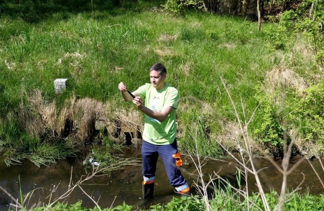 Markus Harzdorf (Staatliche Betriebsgesellschaft für Umwelt und Landwirtschaft) steht mit einem Datenlogger im Ritterbach. / Weiterer Text über ots und www.presseportal.de/nr/177283 / Die Verwendung dieses Bildes für redaktionelle Zwecke ist unter Beachtung aller mitgeteilten Nutzungsbedingungen zulässig und dann auch honorarfrei. Veröffentlichung ausschließlich mit Bildrechte-Hinweis.