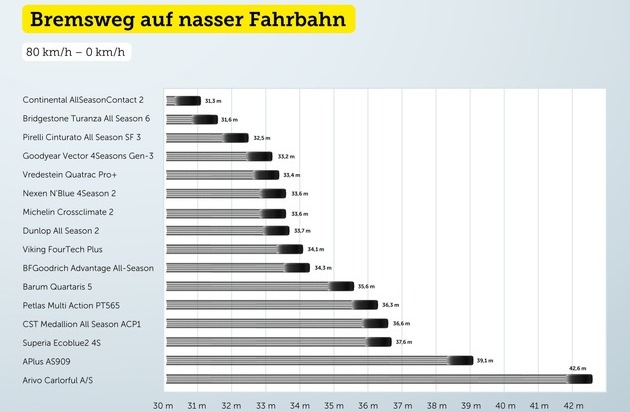 Auf nasser Fahrbahn bei 80 km/h werden die besten Ergebnisse im Bremstest mit dem Continental All Season Contact 2 erzielt und die schlechtesten mit dem Arivo Carlorful A/S. Hier beträgt der Unterschied beim Bremsweg 11,3 Meter: Wenn das mit den Continental-Reifen ausgestattete Fahrzeug zum Stillstand kommt, hat der Wagen mit den Arivo-Reifen noch eine Restgeschwindigkeit von fast 41 km/h, was das Unfallrisiko erheblich erhöht. Auf schneebedeckter Fahrbahn bei 30 km/h sind die Nexen N'Blue 4 Season 2 die besten Reifen, während die Petlas Multiaction PT565 mit einem Bremsweg von zusätzlichen 3,5 Metern am wenigsten überzeugen. Dies entspricht einer Restgeschwindigkeit von 16 km/h - ein erheblicher Unterschied punkto Sicherheit.