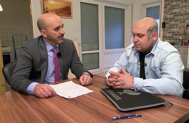 Schuldnerberater Max Postulka will dem verschuldeten Markus (32, re.) helfen. / Weiterer Text über ots und www.presseportal.de/nr/6605 / Die Verwendung dieses Bildes für redaktionelle Zwecke ist unter Beachtung aller mitgeteilten Nutzungsbedingungen zulässig und dann auch honorarfrei. Veröffentlichung ausschließlich mit Bildrechte-Hinweis.