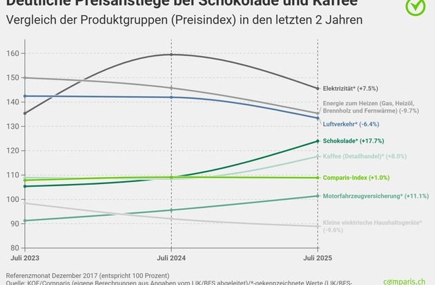 Betrachtet über die letzten 2 Jahre, erhöhten sich die Preise im LIK durchschnittlich um 1,5 Prozent*. Der Comparis-Konsumentenpreis der gefühlten Inflation stieg in dieser Zeit lediglich um 1 Prozent. Seit Juli 2023 haben sich allerdings einige Produkte deutlich verteuert. Hierzu zählen: Schokolade (plus 17,7 Prozent*), Motorfahrzeugversicherung (plus 11,1 Prozent*), Postdienste (plus 8,7 Prozent*), Frucht- und Gemüsesäfte (plus 8,5 Prozent*), Kaffee (Detailhandel) (plus 8,0 Prozent*) und Elektrizität (plus 7,5 Prozent*).