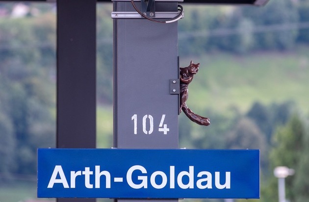 Offiziell lanciert wurde das Jubiläums-Projekt «Nächster Halt» der drei Parteien am 1. September. Seither sorgen die Skulpturen am Bahnhof Arth-Goldau für Aufsehen. Zu sehen – und zu fotografieren – sind unter anderem ein Bartgeier, ein historischer Rigi-Bahn-Schaffner, zwei Schwinger, eine Wanderin oder zwei Sänftenträger. Sie alle nehmen als Repräsentanten der drei Parteien den Bahnhof Arth-Goldau ein und interagieren mit der bestehenden Infrastruktur oder mit Passanten. So badet der Fischotter im Brunnen, der Fuchs durchwühlt den Abfalleimer und die Sänftenträger warten auf «Kundschaft».