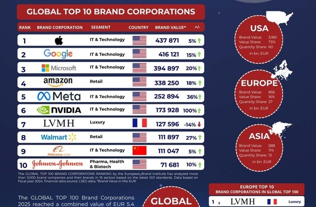 Die GLOBAL TOP 100 Brand Corporations 2025 des European Brand Institute (EBI) verzeichnen ein deutliches Plus von +8,5% und heben den kombinierten Markenwert der führenden internationalen Unternehmen auf über EUR 5,4 Billionen. Wachstumstreiber sind vor allem Technologie, Künstliche Intelligenz (KI), Gesundheitswesen und Handel, während Luxus- und Energiekonzerne durch Nachfragerückgänge und Marktanpassungen unter Druck geraten.
