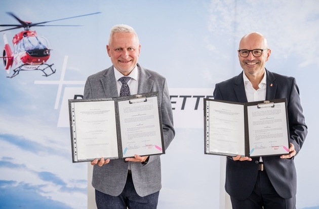 Freuen sich über die Vertragsunterzeichnung: Thomas Blenke (MdL) und Dr. Krystian Pracz, CEO DRF Luftrettung. Die DRF Luftrettung übernimmt den Betrieb der Station Mannheim für weitere 15 Jahre. / Weiterer Text über ots und www.presseportal.de/nr/60539 / Die Verwendung dieses Bildes für redaktionelle Zwecke ist unter Beachtung aller mitgeteilten Nutzungsbedingungen zulässig und dann auch honorarfrei. Veröffentlichung ausschließlich mit Bildrechte-Hinweis.