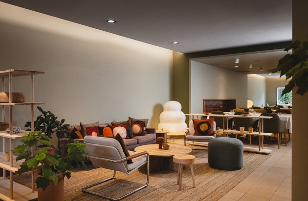 Der Restaurantbereich bietet Platz für 40 Gäste, während eine angrenzende Sonnenterrasse unter schattenspendenden Bäumen zu entspannten Stunden einlädt. Der Eingangsbereich mit Garderobe ist grosszügig gestaltet und geht nahtlos in einen Loungebereich mit Vintage-Möbelstücken über. Ein grosser «Familientisch» steht sowohl Mitarbeitenden als auch spontanen Gästen ohne Reservation zur Verfügung.