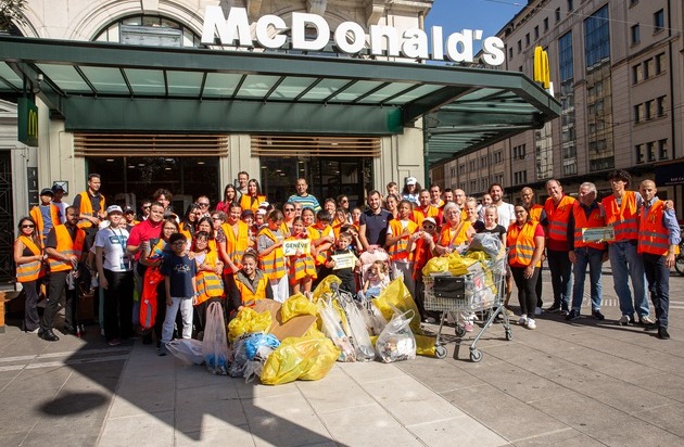 «Fast alle Restaurants von McDonald's Schweiz beteiligen sich am nationalen IGSU Clean-Up-Day. Im Bild: McDonald's-Mitarbeitende und -Gäste in Genf.»
