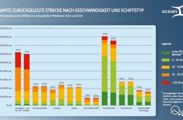 Gesamte zurueckgelegte Strecke nach Geschwindigkeit und Schiffstyp - Vergleich 2023 und 2024 (Copyright OceanCare / Quiet Oceans)