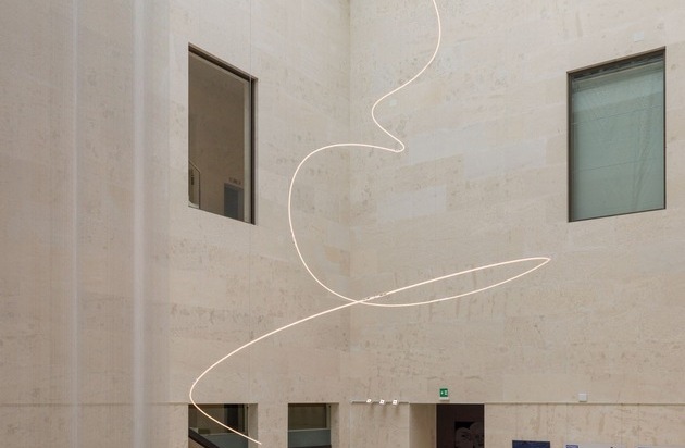 Die drei monumentalen Lichtkreise von Brigitte Kowanz am Dach des Leopold Museum markieren ein dynamisches, weithin sichtbares Zeichen im Stadtbild und wandeln sich im Wechselspiel von Tag und Nacht, von Materialität und immaterieller Erscheinung. Im Falle der Expo Line – welche Brigitte Kowanz als eine der bedeutendsten internationalen Vertreter*innen der Konzept- und Medienkunst ursprünglich für den österreichischen Pavillon der Expo 2020 in Dubai schuf – löst sich die den Lichtkreisen inhärente „unendliche Form“ in die Vertikale und ins Skulpturale auf. Im Leopold Museum, wo die acht Meter hohe Lichtarbeit erstmals in Österreich zu sehen ist, erscheint diese in einem neuen Kontext. Im Dialog mit der großzügigen Steinkubatur des Atriums wird die Lichtspur in ihrer freien, gestischen Anmut und Vielansichtigkeit neu erfahrbar. Die Expo Line eröffnet dadurch neue Wahrnehmungsperspektiven, auch in Bezug auf das Licht- und Raumgefüge der sie umgebenden Architektur.