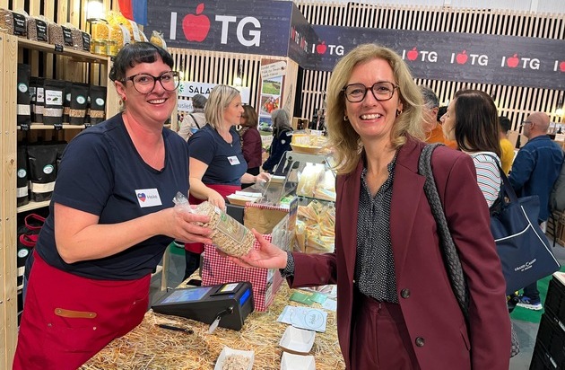 Regierungschefin-Stellvertreterin Sabine Monauni besucht Heike Konrad am Stand der VBO an der OLMA 2025 in St.Gallen. (Quelle: IKR/Doris Frick)