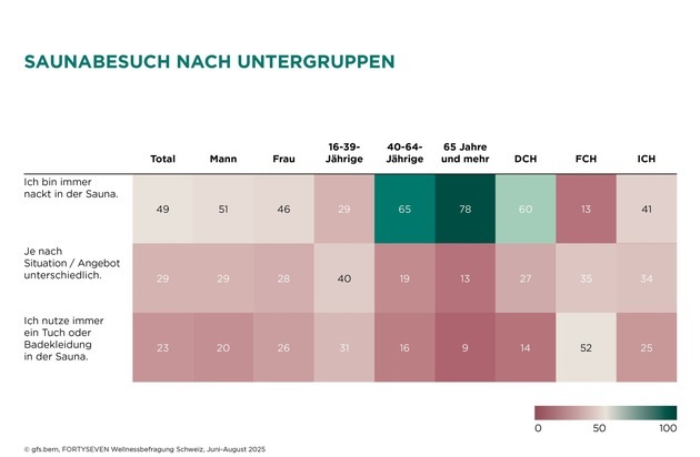 Die Schweiz ist gespalten, wenn es um die Art der Entspannung geht. Eine repräsentative Studie der Wellness-Therme FORTYSEVEN durchgeführt vom Meinungsforschungsinstitut gfs in Bern zeigt: Während in der Deutschschweiz rund 60 Prozent lieber textilfrei schwitzen, verzichten in der Romandie gerade mal 13 % auf ihren Badeanzug in der Sauna.