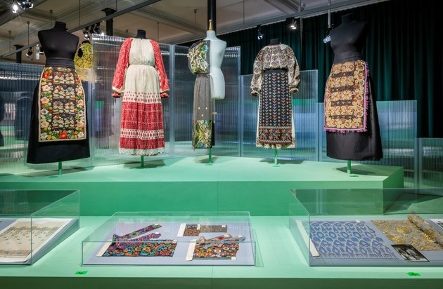 Ein besonderes Augenmerk gilt auch den 1920er-Jahren, die in der Sammlung durch ihre leuchtende Farbigkeit und die Verbindung von Art-déco-Formen mit traditionellen und märchenhaften Motiven hervorstechen. In dieser Zeit kombinierten Textilproduzenten handwerkliche Techniken mit Maschinenstickerei und experimentierten mit neuen, farbechten Farbstoffen – sichtbar in ausdrucksstarken Textilien und einzigartigen Schürzen, die ebenfalls in der Ausstellung gezeigt werden.