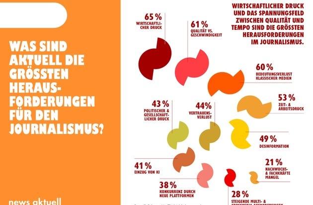 An der Spitze der Herausforderungen im Journalismus steht der wirtschaftliche Druck: 65 Prozent der Befragten nennen sinkende Einnahmen, rückläufige Auflagenzahlen und fehlende alternative Geschäftsmodelle als aktuell grösste Herausforderung für den Journalismus. Auch der Spagat zwischen Qualität und Geschwindigkeit (61 Prozent) - also der Balance zwischen schnellen News und einer gründlichen Recherche - sowie der Bedeutungsverlust traditioneller Medien durch veränderte Mediennutzung (60 Prozent) werden als zentrale Probleme benannt.