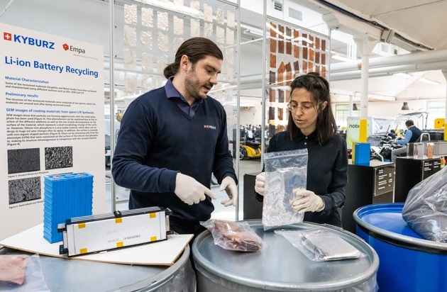 Nora Bartolomé (Empa) und Olivier Groux (Kyburz Schweiz AG) arbeiten zusammen an der Rückgewinnung von hochwertigen Rohstoffen aus Lithium-Ionen-Batterien. ©Innosuisse.