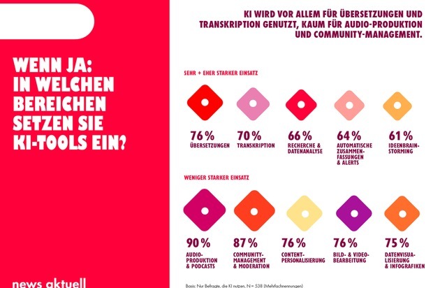 Noch viel seltener kommt Künstliche Intelligenz in kreativen oder publikumsnahen Bereichen zum Einsatz. So geben 90 Prozent an, dass KI-Tools bei Audio-Produktionen und Podcasts weniger stark im Einsatz sind. Und auch Community-Management ist weiterhin fest in menschlicher Hand (weniger starker Einsatz: 87 Prozent).