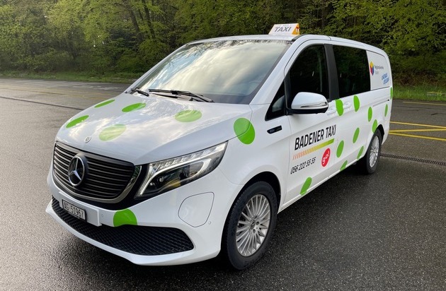 Die grüne Flotte der Badener Taxi 24/7 GmbH besteht aus sechs Elektrofahrzeugen: Vier Grosstaxis des Typs Mercedes-Benz EQV (im Bild) ergänzen zwei Tesla-Limousinen. (Bild: Badener Taxi 24/7 GmbH)