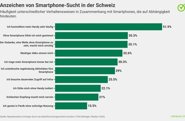 Die Angst, ohne Handy zu sein, hat die Schweiz fest im Griff: Mehr als 70 Prozent der Bevölkerung zeigen mässige bis ausgeprägte Anzeichen von «Nomophobie». Besonders gross ist die Abhängigkeit bei den 16- bis 35-Jährigen – fast die Hälfte dieser Altersgruppe leidet unter deutlichen Stresssymptomen. Überraschend ist jedoch: Auch Eltern mit Kindern im Haushalt zeigen signifikant stärkere Anzeichen von Smartphone-Abhängigkeit als Kinderlose. Das zeigt eine repräsentative Umfrage von Comparis. «Für Eltern ist das Smartphone kein reines Kommunikationsmittel mehr, sondern ein unentbehrliches Werkzeug zur Koordination von Terminen, Schule und Notfällen. Das Gerät auszuschalten, wird zu einem Luxus, den sich viele nicht mehr leisten können», sagt Comparis-Digitalexperte Jean-Claude Frick.