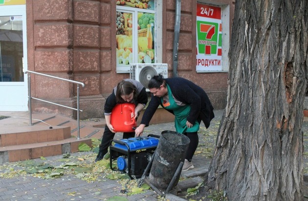 Ukraine – Odessa – 17.11.2024: Zwei Frauen tanken einen Generator auf der Strasse auf, um einen Laden während eines Stromausfalls am Laufen zu halten, der durch russische Angriffe auf die Energieinfrastruktur verursacht wurde © Nataliia Mykhailenko /ukrainianphotodiary.org