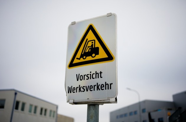 Ein digitales Ausbildungssystem, das Sprachbarrieren überwindet und Sicherheit am Arbeitsplatz erhöht: Das EU-geförderte Interreg-Projekt ILL zeigt, wie grenzübergreifende Zusammenarbeit die Fachkräftequalifikation in Europa neu gestaltet. Warnschild "Vorsicht Werksverkehr" auf dem Gelände des Unternehmens. / Weiterer Text über ots und www.presseportal.de/nr/181564 / Die Verwendung dieses Bildes für redaktionelle Zwecke ist unter Beachtung aller mitgeteilten Nutzungsbedingungen zulässig und dann auch honorarfrei. Veröffentlichung ausschließlich mit Bildrechte-Hinweis.