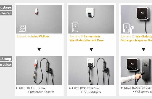 1. Eine Lösung für alle Szenarien: Der JUICE BOOSTER 3 air deckt alle Ladesituationen ab, egal ob Steckdose oder Ladestation mit oder ohne Kabel.