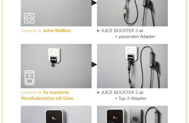 - Eine Lösung für alle Szenarien: Der JUICE BOOSTER 3 air deckt alle Ladesituationen ab, egal ob Steckdose oder Ladestation mit oder ohne Kabel.