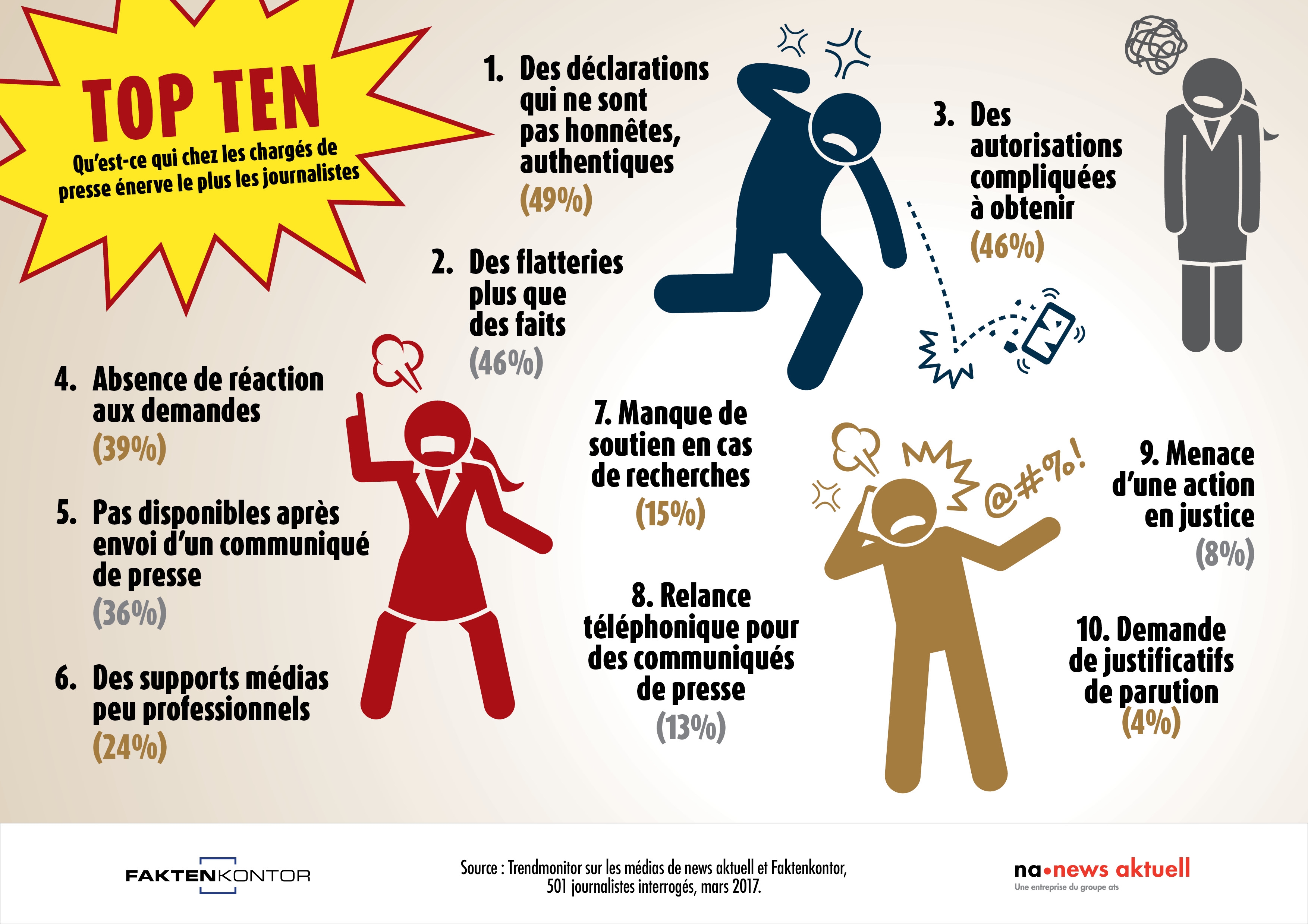 1. Des déclarations qui ne sont pas honnêtes, authentiques: 49% 2. Des flatteries plutôt que des faits: 46% 3. Des autorisations compliquées à obtenir: 46% 4. Absence de réaction aux demandes: 39% 5. Pas disponibles après envoi d'un communiqué de presse: 36% 6. Des supports médias peu professionnels: 24% 7. Manque de soutien en cas de recherches: 15% 8. Relance téléphonique pour des communiqués de presse: 13% 9. Menace d'une action en justice: 8% 10. Demande de justificatifs de parution: 4%