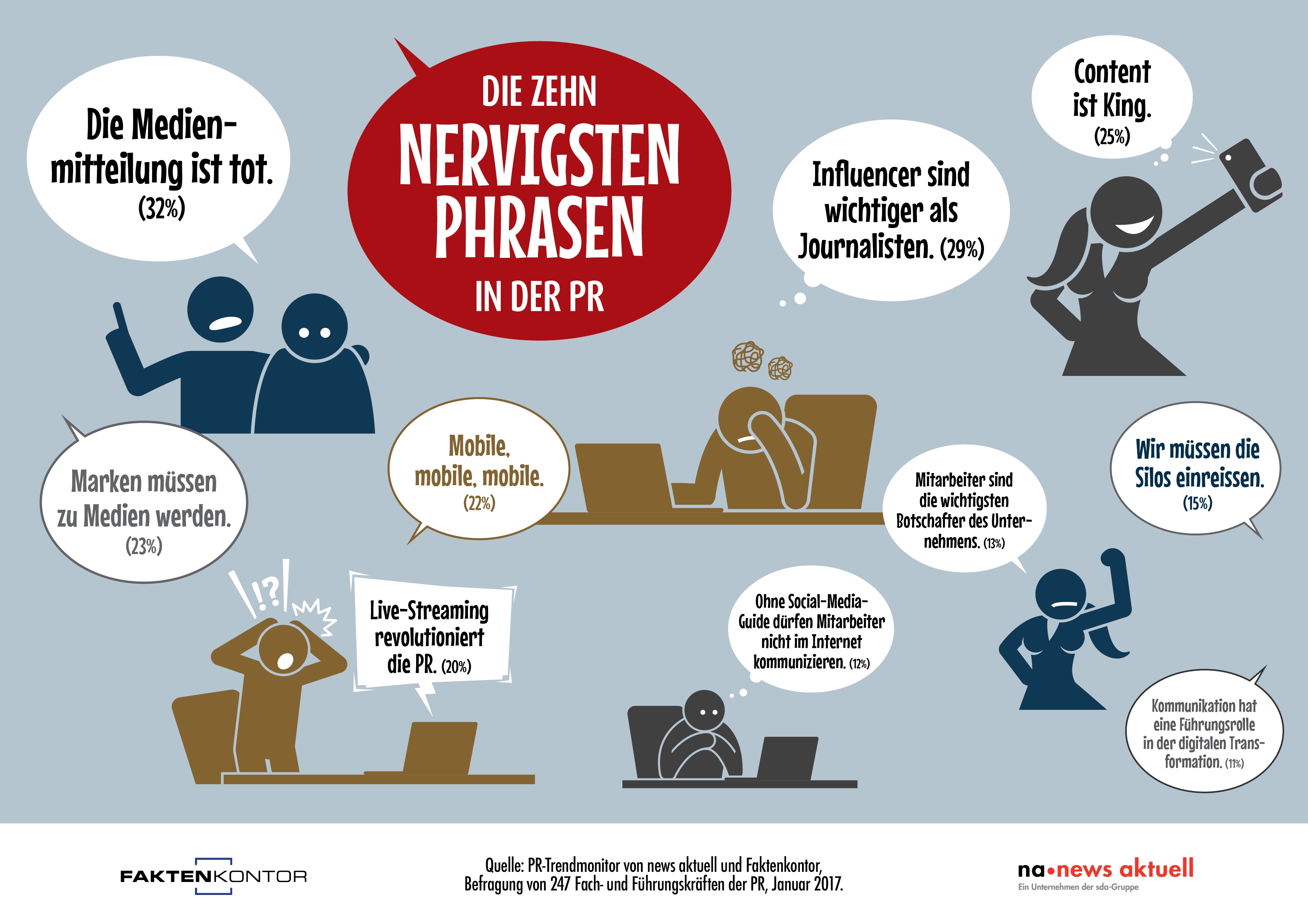 Für den meisten Unmut unter den Befragten sorgt demnach die immer wiederkehrende Prophezeiung vom Untergang der Medienmitteilung. Jeder dritte PR-Profi ist von dem Satz "Die Medienmitteilung ist tot" genervt (32 Prozent). Fast genauso viele Umfrageteilnehmer können es nicht mehr hören, dass Influencer wichtiger als Journalisten sind (29 Prozent). Auch die Behauptung, Inhalt gehe über alles, ist für jeden vierten Kommunikationsprofi kalter Kaffee. Von der Aussage "Content ist King" sind 25 Prozent genervt, ebenso von dem Mantra "Marken müssen zu Medien werden." (23 Prozent)