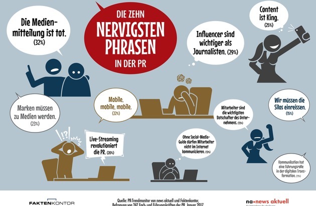 "Die Medienmitteilung ist tot." Das ist für PR-Schaffende die nervigste Phrase der letzten zwölf Monate. Auf Platz zwei der PR-Buzzwords schafft es die Aussage "Influencer sind wichtiger als Journalisten", gefolgt von "Content ist King." Zu diesem Ergebnis kommt der aktuelle PR-Trendmonitor der sda-Tochter news aktuell und Faktenkontor. Rund 250 Fach- und Führungskräfte aus Medienstellen und PR-Agenturen haben sich an der Umfrage beteiligt.