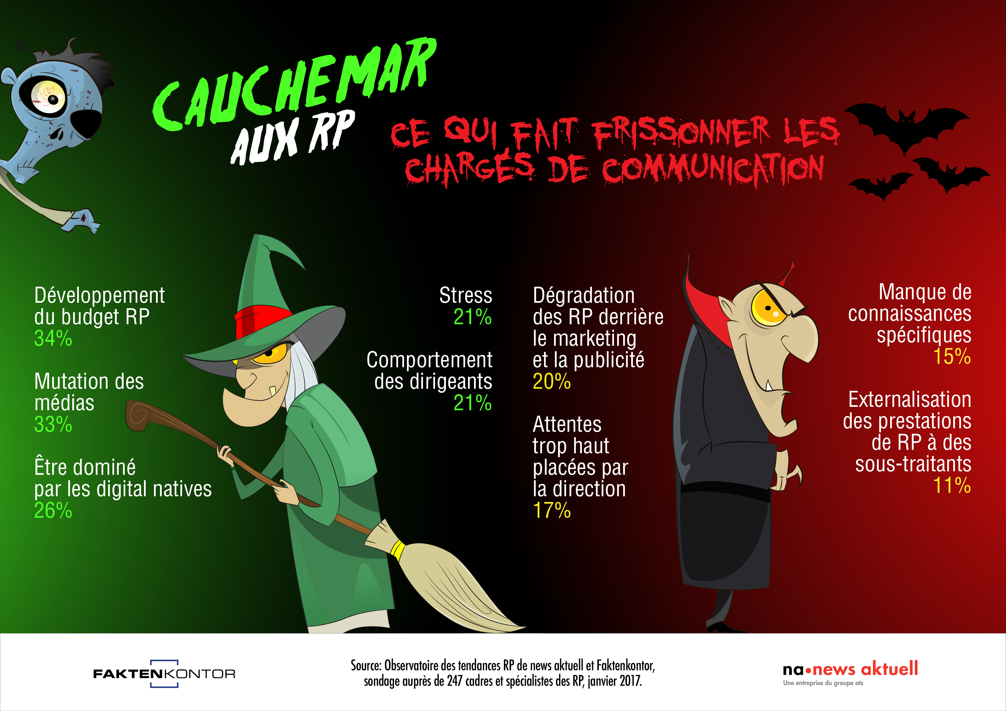 1. Développement du budget RP: 34% 2. Mutation des médias: 33% 3. Être dominé par les «digital natives»: 26% 4. Stress: 21% 5. Comportement des dirigeants: 21% 6. Dégradation des RP derrière le marketing et la publicité: 20% 7. Attentes trop haut placées par la direction: 17% 8. Manque de connaissances spécifiques: 15% 9. Externalisation des prestations de RP à des sous-traitants: 11%