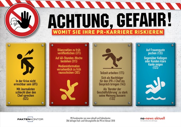 1. In der Krise nicht erreichbar sein 69 % 2. Mit Journalisten schlecht über den Chef sprechen 52 % 3. Bilanzzahlen zu früh veröffentlichen 37 % 4. Auf 40-Stunden-Woche bestehen 31 % 5. Medieninformation versehentlich zu früh rausschicken 30 % 6. Teilzeit arbeiten 17 % 7. Sich als Nachfolger für den (PR-)Chef ins Gespräch bringen 14 % 8. Als 'Berater der Geschäftsführung' zu stark seine Meinung äussern 13 % 9. Auf Frauenquote pochen 13 % 10. Gegenüber Kollegen oder Kunden klare Kante zeigen 12 %