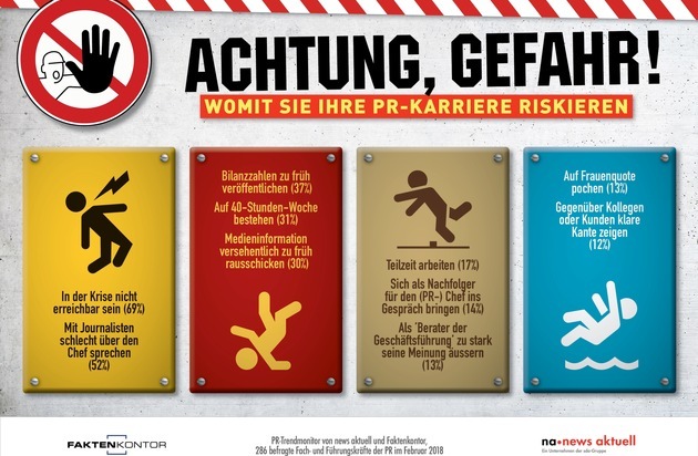 1. In der Krise nicht erreichbar sein 69 % 2. Mit Journalisten schlecht über den Chef sprechen 52 % 3. Bilanzzahlen zu früh veröffentlichen 37 % 4. Auf 40-Stunden-Woche bestehen 31 % 5. Medieninformation versehentlich zu früh rausschicken 30 % 6. Teilzeit arbeiten 17 % 7. Sich als Nachfolger für den (PR-)Chef ins Gespräch bringen 14 % 8. Als 'Berater der Geschäftsführung' zu stark seine Meinung äussern 13 % 9. Auf Frauenquote pochen 13 % 10. Gegenüber Kollegen oder Kunden klare Kante zeigen 12 %