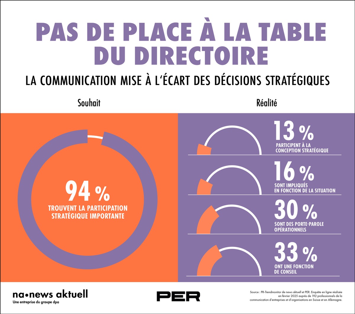 La majorité des responsables de la communication considèrent la communication d'entreprise comme très importante lorsqu'il s'agit de prendre des décisions stratégiques - mais l'implication effective reste souvent un souhait. Ainsi, le PR-Trendmonitor 2025 de news aktuell, filiale de la dpa, et de PER montre que 94 % des personnes interrogées considèrent qu'il est important d'être assis à la table des décisions stratégiques de l'entreprise. Mais en réalité, seuls 13 % font partie intégrante de l'équipe de décision stratégique. 192 professionnels de la communication issus d'entreprises et d'organisations en Suisse et en Allemagne ont participé à l'enquête en ligne.
