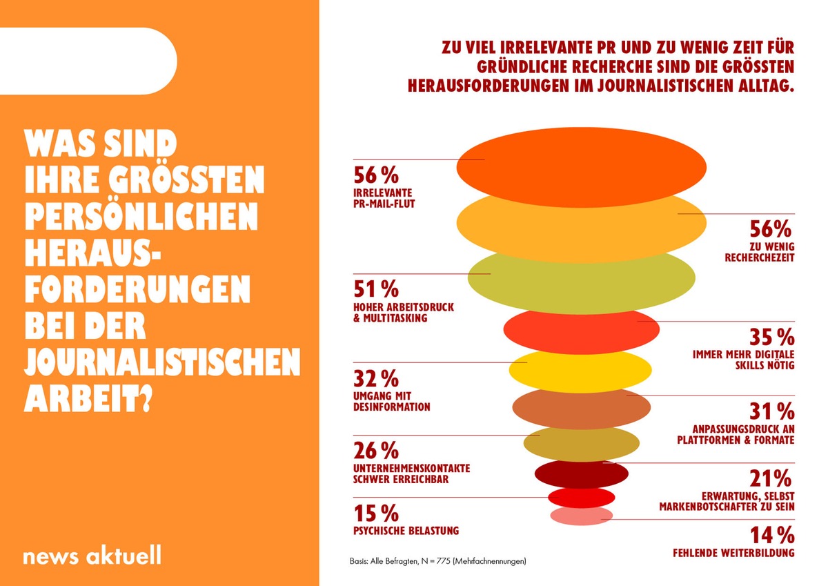 Wirtschaftlicher Druck, das Spannungsfeld zwischen Qualität und Tempo sowie der Bedeutungsverlust traditioneller Medien sind aktuell die grössten Herausforderungen für den Journalismus. Den Alltag der Medienschaffenden belasten vor allem zu viele irrelevante PR-Mails und zu wenig Zeit für tiefergehende Recherche. Zu diesen Ergebnissen kommt der Medien-Trendmonitor von news aktuell. Die Umfrage der dpa-Tochter gibt Einblicke in die Arbeitsweise, die Zusammenarbeit mit Medienstellen und PR-Agenturen sowie in die Herausforderungen und Trends im Journalismus. Am Medien-Trendmonitor 2025 haben mehr als 1'000 Journalistinnen und Journalisten aus der Schweiz, Deutschland und Österreich teilgenommen.
