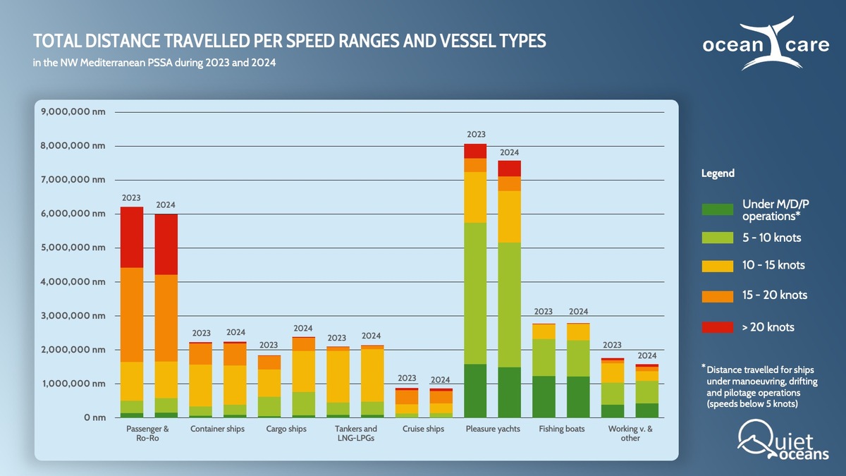 According to the data from the analysis – carried out by Quiet Oceans and commissioned by OceanCare – the overall navigation behaviour of ships, especially in terms of average speeds, remained stable in both years. Of the nearly 48 million kilometres travelled by all ships sailing in the waters of this PSSA in 2023 and 2024, 57% of the total distance travelled was at speeds above 10 knots, with no significant variations between the two years (56.9% in 2023 and 57.5% in 2024).