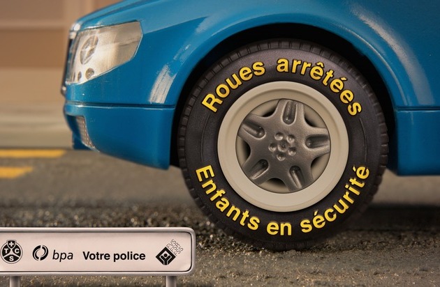 La Police distribue dans toute la Suisse à l'occasion de cette rentrée scolaire des boîtes de craies colorées, pour inciter les automobilistes à écrire sur le côté des pneus le message « Roues arrêtées, enfants en sécurité » et à le publier sur Twitter, Facebook et/ou Instagram avec le hashtag #enfantsensecurite.