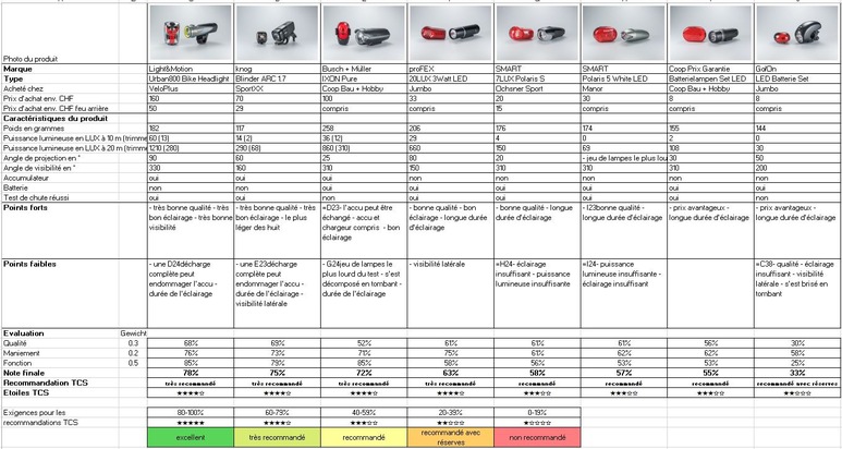 Au final, quatre des huit éclairages ont obtenu la mention TCS "très recommandé". Les lampes suffisamment visibles, mais ne fournissant pas assez de lumière dans la nuit noire ont encore reçu la mention "recommandé". Un seul phare a été distancé et a dû se contenter de la mention "recommandé avec réserves" en raison de sa fonctionnalité et de sa qualité insuffisantes.