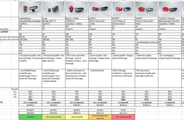 Au final, quatre des huit éclairages ont obtenu la mention TCS "très recommandé". Les lampes suffisamment visibles, mais ne fournissant pas assez de lumière dans la nuit noire ont encore reçu la mention "recommandé". Un seul phare a été distancé et a dû se contenter de la mention "recommandé avec réserves" en raison de sa fonctionnalité et de sa qualité insuffisantes.