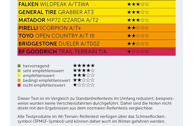 Auf Schnee sind die Ergebnisse je nach Modell sehr unterschiedlich. Der Yokohama Geolandar A/T G015 ist der einzige All-Terrain-Reifen, der das Prädikat "gut" erhält und gleichauf mit dem Ganzjahresreifen rangiert. Die Reifen von Falken, General Tire, Matador, Toyo und BF Goodrich wurden mit "befriedigend" bewertet. Pirelli und Bridgestone hingegen erhielten ein "genügend".