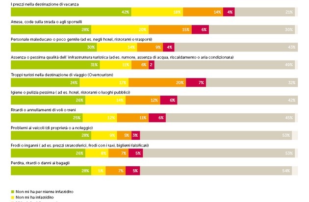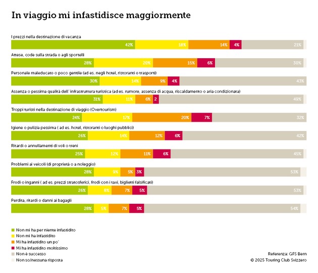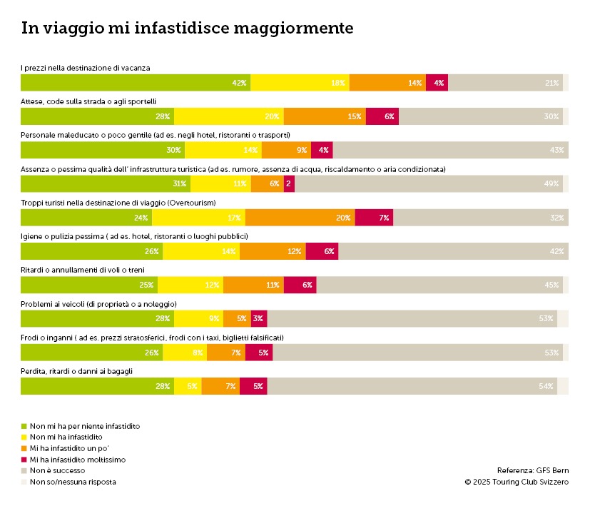 Le vacanze regalano molte esperienze positive, ma non senza qualche seccatura. Nell'ultimo barometro dei viaggi, il TCS ha chiesto per la prima volta quali fattori abbiano creato disturbo. Nel sondaggio rivolto alla popolazione, il sovraffollamento turistico (detto overtourism) si è posizionato nettamente in cima alla classifica. Anche i tempi di attesa agli sportelli o per strada, al pari dei prezzi elevati, disturbano la popolazione svizzera durante i viaggi. I soci del TCS descrivono una situazione simile, anche se la scortesia del personale viene citata come principale motivo di fastidio.